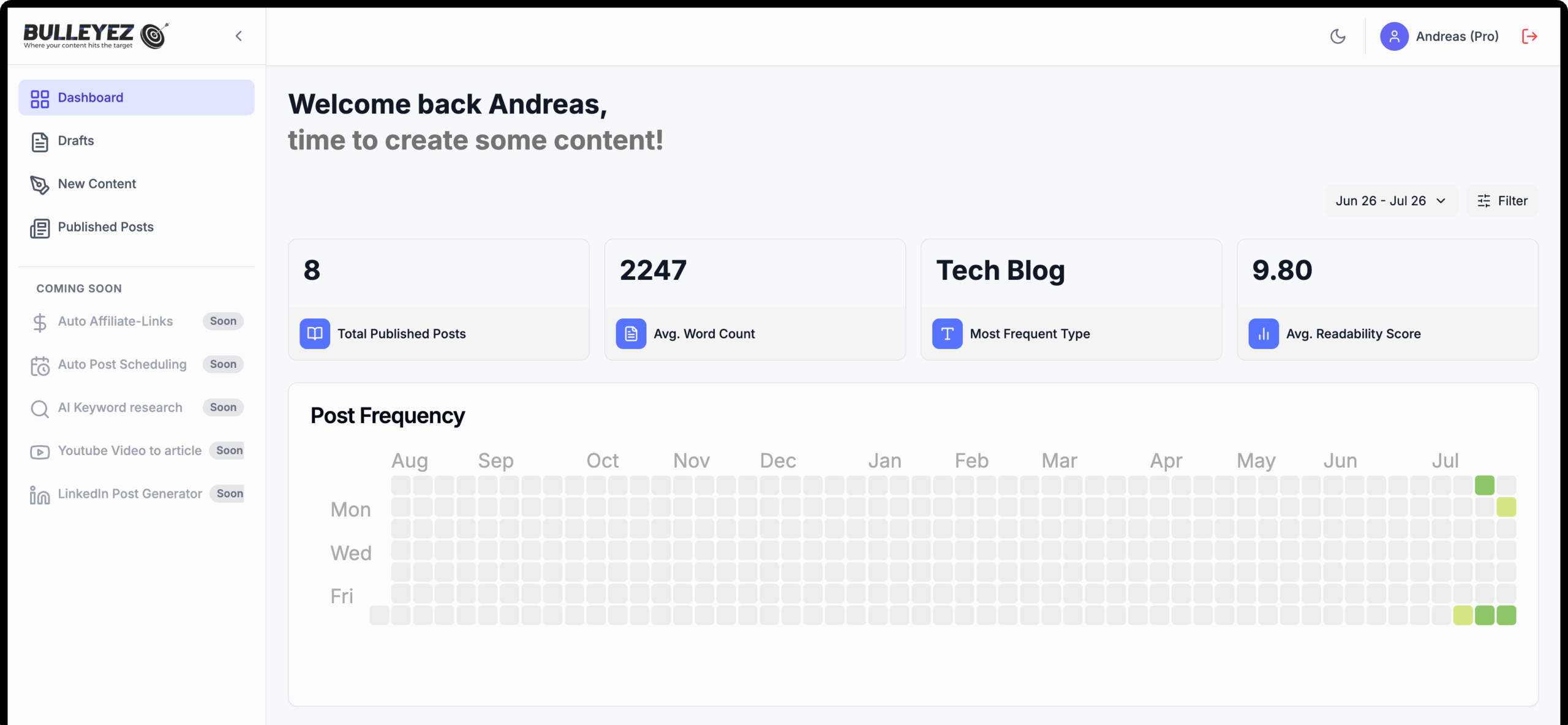 Bulleyez is your all-in-one platform to generate SEO optimized, high-ranking articles, analyze performance, and overcome writer’s block for good.